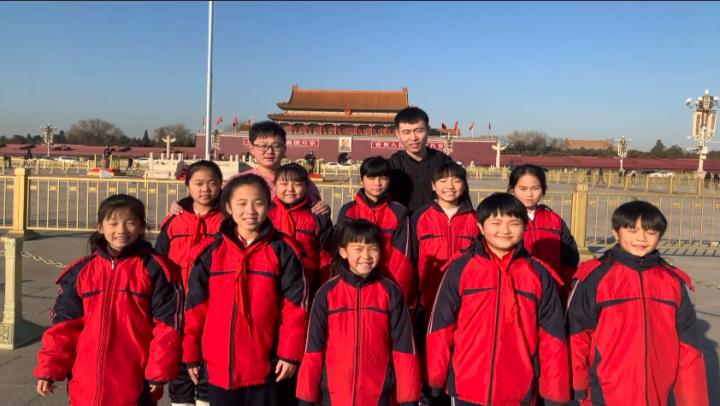 李平、张雨带“村里的孩儿”音乐班的孩子前往北京录制节目时,在天安门广场合影留念。图片来源:中国文明网
