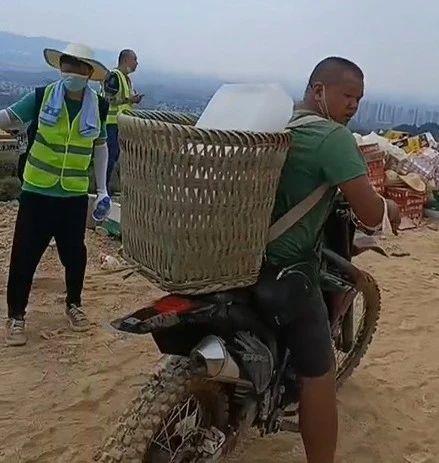 2022年8月,重庆多地发生山火,张俊骑摩托车运送冰块上山帮助灭火。图片来源:中国文明网