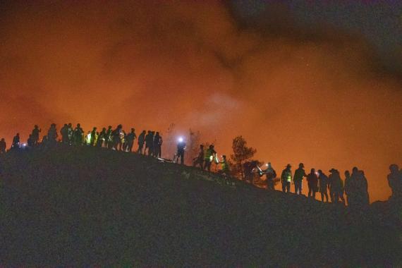 2022年8月25日晚,在重庆市北碚区缙云山,现场救援人员坚守在火场一线灭火。新华社记者 黄伟 摄
