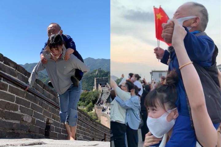 张应贤背着爷爷爬长城、看升旗。资料图片