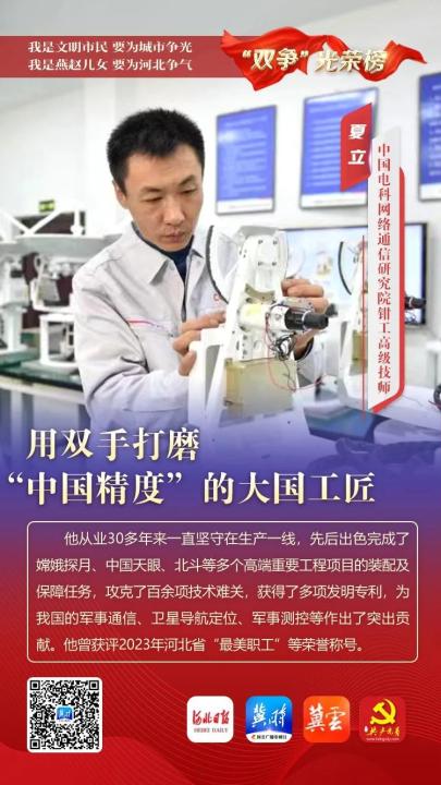 夏立,男,1971年7月出生,中国电科网络通信研究院钳工高级技师。他从业30多年来一直坚守在生产一线,先后出色完成了嫦娥探月工程、中国天眼、北斗等多个高端重要工程项目的装配及保障任务,攻克了百余项技术难关,获得了多项发明专利,为我国的军事通信、卫星导航定位、军事测控等作出了突出贡献。曾获评2023年河北省“最美职工”等荣誉称号。