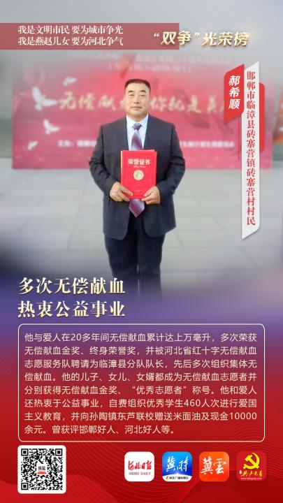郝希顺,男,1967年11月出生,邯郸市临漳县砖寨营镇砖寨营村村民。他与爱人在20多年间无偿献血累计达上万毫升,多次荣获无偿献血金奖、终身荣誉奖,并被河北省红十字无偿献血志愿服务队聘请为临漳县分队队长,先后多次组织集体无偿献血。他的儿子、女儿、女婿都成为无偿献血志愿者并分别获得无偿献血金奖、“优秀志愿者”称号。他和爱人还热衷于公益事业,自费组织优秀学生460人次进行爱国主义教育,并向孙陶镇东芦联校赠送米面油及现金10000余元。曾获评邯郸好人、河北好人等。
