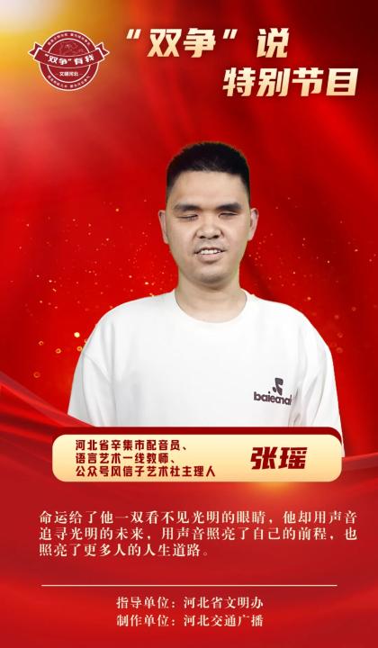 能够为家乡做点儿力所能及的事情,为推广家乡的“全民阅读”和“文化辛集”做出自己的一点儿贡献,张瑶乐在其中。上帝给了他黑色的眼睛,但也给了他明亮的声音。黑暗中的朗读者,可以照亮眼前漆黑的世界。