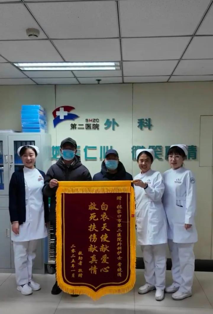 老人及家属赠送锦旗向常晓清(右二)致谢
