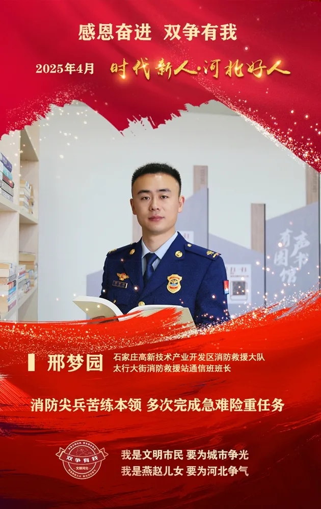 邢梦园,男,1994年6月出生,中共党员,石家庄市高新技术产业开发区消防救援大队太行大街消防救援站通信班班长。邢梦园投身消防工作以来,在与火灾的长期斗争中锤炼出英勇无畏的战斗作风,累计参与各类救援400余次,救出疏散60余人。作为宣传员与培训员,邢梦园主动承担辖区微型消防站培训,利用业余时间上门指导,提升初期火灾处置能力;通过消防站开放日,组织“沉浸式”消防体验活动,增强群众消防安全意识。曾荣获“河北省优秀消防员”“石家庄市文明市民”等荣誉称号,荣立个人三等功一次。(石家庄市推荐)