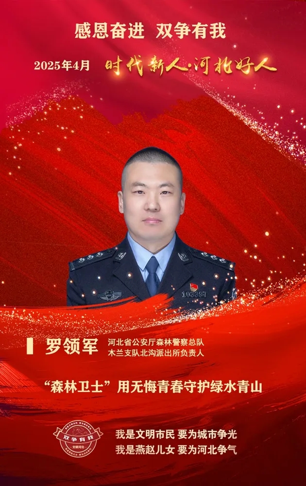 罗领军,男,满族,1987年1月出生,中共党员,河北省公安厅森林警察总队木兰支队北沟派出所负责人、三级警长职务。他不忘初心投身家乡林业警务,11年坚守巡山;爱岗敬业,参与解救野生动物、破获多起涉林案件;坚守林区服务为民,帮扶困难群众,用青春守护绿水青山。曾荣获“森林卫士”荣誉称号,被河北省森林公安局记三等功。(承德市推荐)