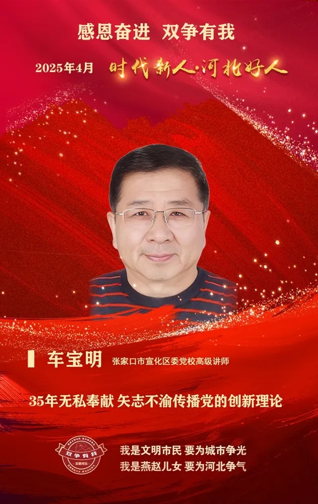 车宝明,男,1965年7月出生,中共党员,张家口市宣化区委党校高级讲师。他35年如一日奋战在理论教学研究、党的创新理论宣传宣讲工作一线,先后撰写理论文章46篇,在市级以上刊物发表论文30篇,被领导、同事和群众誉为传播践行党的创新理论的“领头雁”。曾荣获中宣部2023年基层理论宣讲先进个人,连续9次被评为省委讲师团系统优秀基层宣讲员。(张家口市推荐)