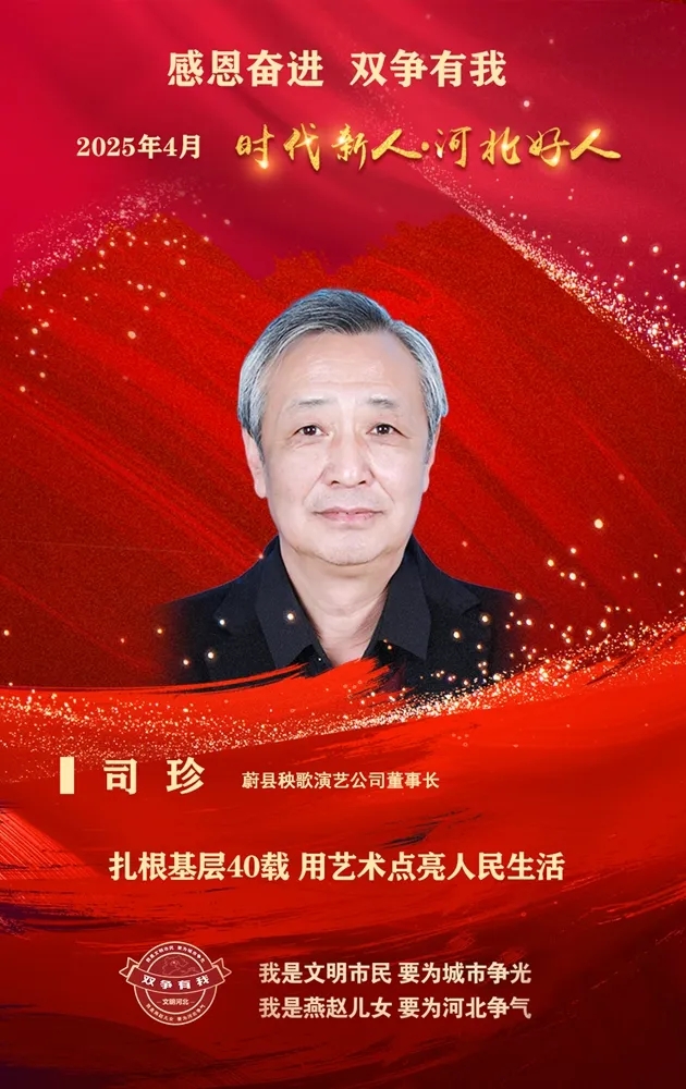司珍,男,1963年出生,中共党员,蔚县秧歌演艺公司董事长。司珍带领团队传承创新蔚县秧歌,打造系列文旅演出项目,创排《剪纸谣》《魏象枢》等精品剧目,助力非遗登上央视与首都舞台。他放弃名利募集经费,带队完成冬奥会演出,年均“文化下乡”300余场,以坚守与奉献诠释基层文艺工作者的使命担当。先后荣获燕赵文化之星、省优秀剧协会员、全省文化文物旅游系统先进工作者、德艺双馨文艺家等称号。(张家口市推荐)
