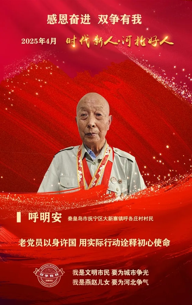 呼明安,男,1928年8月出生,中共党员,秦皇岛市抚宁区大新寨镇呼各庄村村民。1962年国家困难,他回乡任村支书,立下“干不好就辞职”的军令状,以部队作风抓党建,带头劳动,带领村民一年打出11口井、建成梯田,实现作物丰收。在村里一干就是二十多年,兢兢业业、尽职尽责,带领村民发展致富。曾荣获解放东北功勋奖章、解放华北功勋奖章、解放华中南功勋奖章和解放全中国功勋奖章等多项荣誉。(秦皇岛市推荐)