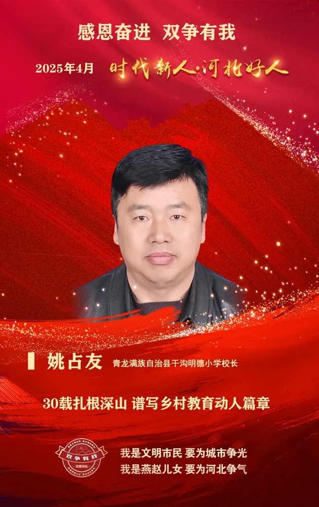 姚占友,男,1975年5月出生,中共党员,青龙满族自治县干沟明德小学校长。1994年,19岁的姚占友踏上乡村教育讲台,从小学教师到校长,始终扎根大山。2021年,他调任干沟明德小学,面对超半数留守儿童和特殊家庭学生,他以校为家,像父亲般陪伴孩子,坚持家访、排查隐患、关注学生心理,践行“有教无类” 理念。三十年来,他用爱与责任谱写着乡村教育的动人篇章。(秦皇岛市推荐)