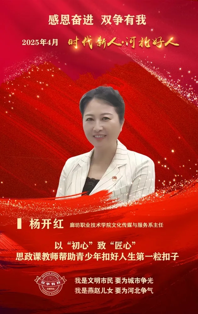 杨开红,女,1971年7月出生,中共党员,廊坊职业技术学院文化传媒与服务系主任。1995年怀揣共产党人的初心,她成为了一名思政课教师。多年来始终坚守“德为师之本”,努力做到政治强、情怀深、思维新、视野广、自律严、人格正,把做“四有好老师”作为自己的人生航标。曾获2022年冬奥会和冬残奥会河北省先进个人、河北省学校思想政治教育先进工作者、河北省优秀青年志愿者等荣誉称号。(廊坊市推荐)