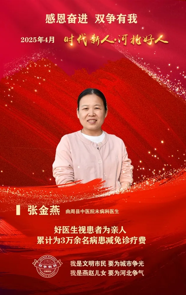 张金燕,女,1983年4月出生,中共党员,曲周县中医院未病科主任。她扎根基层中医药事业15年,平均每天接诊时间超过10个小时,治愈病患5万余人,为3.2万余人减免部分治疗费用,为3千多名患者免费推拿、正骨。荣获“河北省最美医护”“河北省青年中医临床技术骨干”“邯郸好人”“邯郸市优秀青年中医人才”等荣誉称号。(邯郸市推荐)