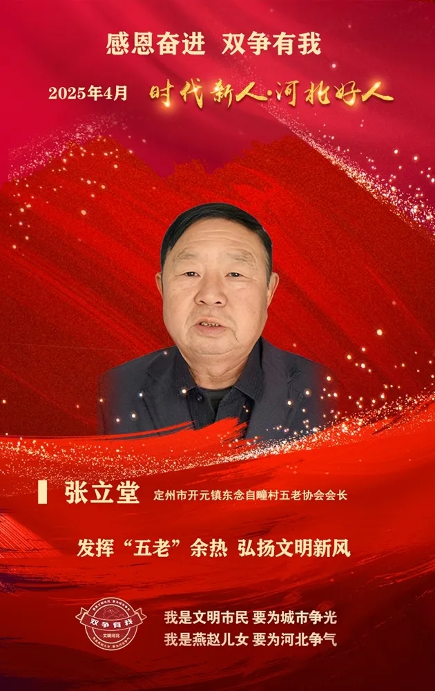 张立堂,男,1958年8月出生,中共党员,定州市开元镇东念自疃村五老协会会长。他响应号召建设家乡,针对农村陋习,成立“五老协会”倡导移风易俗,制定红白事标准;调解邻里纠纷,维护村庄和谐;开办书法公益班,每周六为村里的孩子们讲授书法课程。他用行动推动乡村文明建设,成为党员担当的生动写照。(定州市推荐)