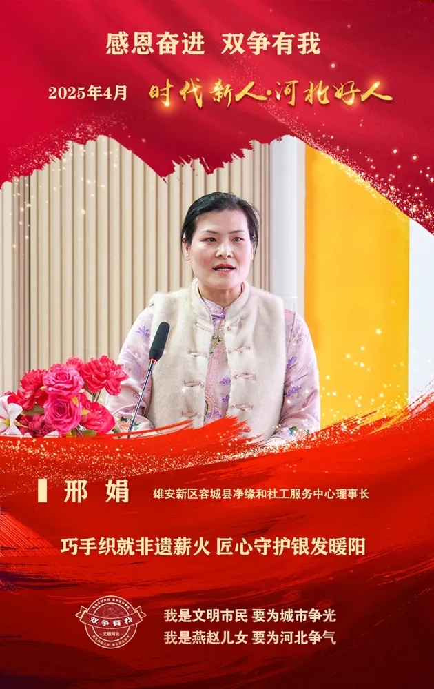 邢娟,女,满族,1981年3月出生,雄安新区容城县净缘和社工服务中心理事长,非遗衍纸传承人。自2022年净缘和社工服务中心成立以来,邢娟一边执衍纸金丝银线编织妇女创业梦,一边握养老档案本叩响长者幸福门,累计为90余名妇女提供就业机会,为240余名容西回迁老年人提供居家养老服务。在传统与现代交织的经纬线上,邢娟绣出了“让文化遗产活起来、让银发群体暖起来”的初心答卷。(雄安新区推荐)