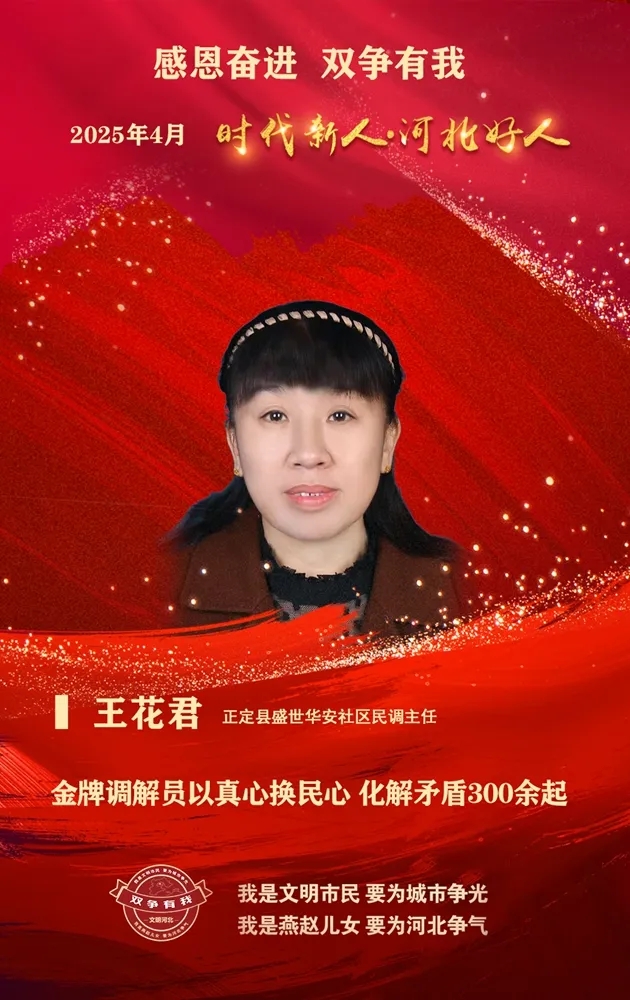 王花君,女,1970年2月出生,正定县盛世华安社区民调主任。自2015年以来,她一直在盛世华安社区工作,是社区的“金牌调解员”,曾调解邻里矛盾300余起,家庭婚姻矛盾168余起,婆媳矛盾关系200余起,诉前调解260多起,充分发挥了社区人民调解“第一道防线”的作用。荣获正定县道德模范、正定县社区金牌调解员等荣誉称号。(石家庄市推荐)