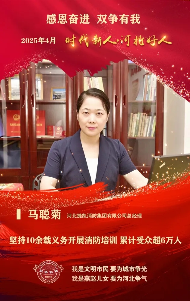马聪菊,女,1975年7月出生,无党派人士,河北捷凯消防集团有限公司总经理。她几十年如一日热衷于公益事业,关心聋哑孩子、帮助困难家庭、志愿为社会提供力所能及的服务,她助人为乐、扶危济困从不吝啬;她暖心善行、好事做尽从未间断,深得同事、朋友和群众的好评。曾荣获“涿州好人”“保定好人”等荣誉称号。(保定市推荐)