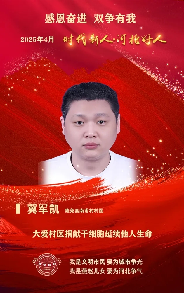 冀军凯,男,1986年3月出生,隆尧县南甫村村医。2024年11月28日11时30分,在石家庄平安医院造血干细胞采集室,冀军凯接受了近四个小时的造血干细胞采集后,成功成为全国第18965例、河北省第814例、邢台市第50例、隆尧县第2例造血干细胞捐献者。获评2024年“泉城好人”。(邢台市推荐)