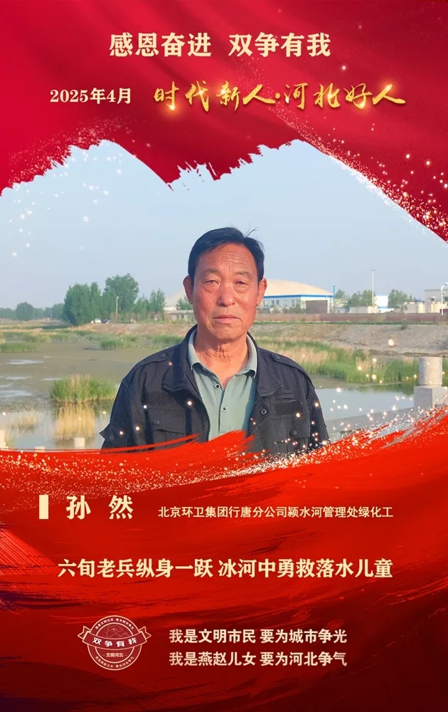 孙然,男,1957年11月出生,中共党员,北京环卫集团行唐分公司颍水河管理处绿化工。2024年3月21日,在行唐县城颍水河边一名玩耍的儿童不慎落水,他不顾个人安危,跳入河中,成功将落水儿童救上岸。2024年入选中央政法委见义勇为勇士榜。(石家庄市推荐)