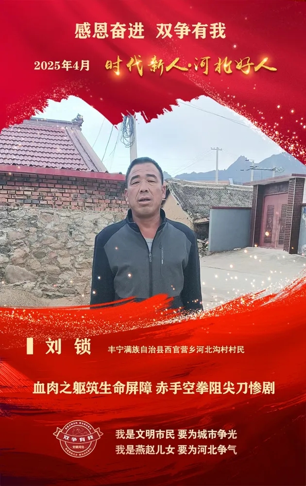 刘锁,男,1977年12月出生,丰宁满族自治县西官营乡河北沟村村民。面对失控的邻居持刀行凶,刘锁毫不犹豫地冲进险境,徒手挡刀,身中两刀仍拼死护住邻居家的孩子。他的英勇之举不仅挽救了一个家庭,更用血肉之躯诠释了平凡人的伟大。(承德市推荐)