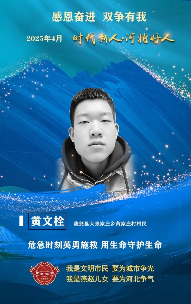 黄文栓,男,2007年11月出生,隆尧县大张家庄乡黄家庄村村民,生前系邢台技师学院学生。2023年9月,黄文栓为营救落水同伴,在湍急的泜河中耗尽体力英勇牺牲。先后被追授市县“见义勇为模范”称号,荣登“泉城好人榜”。(邢台市推荐)