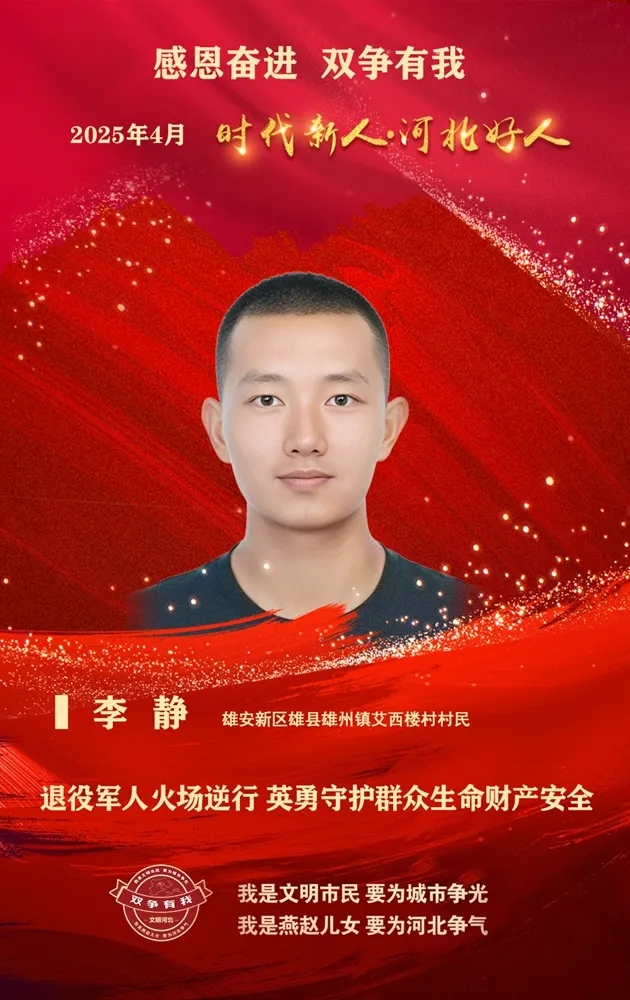 李静,男,1992年12月生,中共党员,雄县雄州镇艾西楼村村民。2025年2月28日,退役军人李静途经雄县一饭店火灾现场,迅速组织40余名群众疏散、切断电源。面对随时可能爆炸的危急火情,他凭借服役经验三秒研判,带领众人控火,更攀爬3米屋顶,以特种技术直抵火源核心区,徒手握水枪压制火势,成功保护数百万财产安全。李静曾荣获个人嘉奖3次、优秀士兵2次和个人三等功1次。(雄安新区推荐)