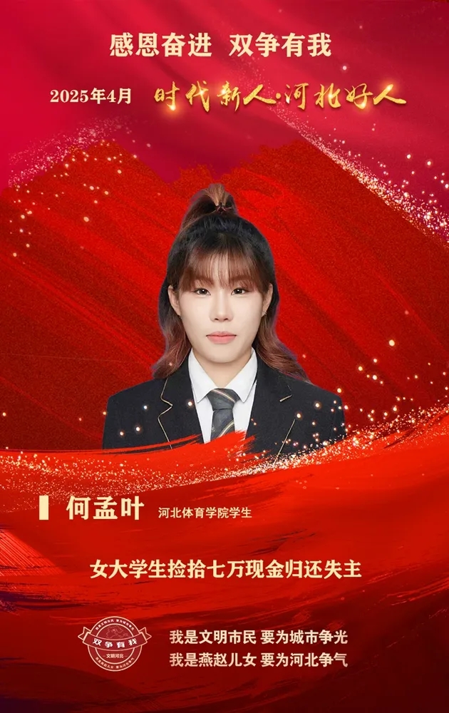 何孟叶,女,2004年5月出生,河北体育学院学生。2025年1月,假期探亲时她捡到了装有七万元现金的一个黑色公文包,当时她赶忙在附近寻找失主,但没有找到。于是,她决定冒着寒风在原地等待失主。半个多小时后,失主赶到,何孟叶根据包里的身份证向其核实身份后,立即将公文包还给了失主。(廊坊市推荐)