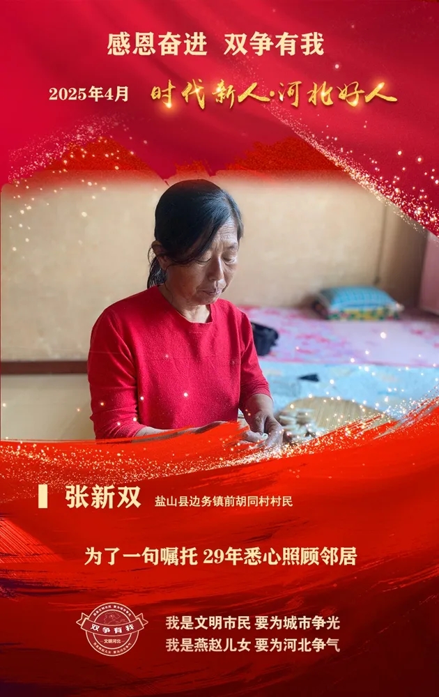 张新双,女,1969年8月出生,盐山县边务镇前胡同村村民。29年前,张新双嫁入婆家后,与婆婆一同照顾邻居张景华一家,婆婆在临终前嘱托张新双要照顾好邻居一家。29年来,张新双信守承诺,独自挑起了照顾张景华一家的重担。寒来暑往五十载,张新双婆媳两代人用坚持与承诺,超越血缘界限,温暖着邻里,也感染着周围村民。(沧州市推荐)