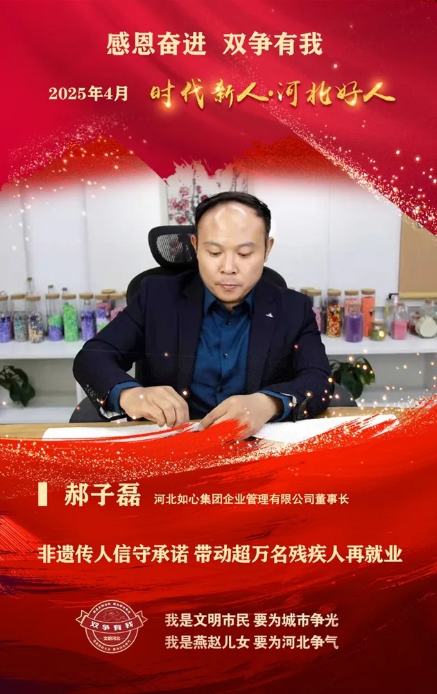 郝子磊,男,1980年1月出生,河北如心集团企业管理有限公司董事长。作为邱县非遗珠绣传统手工的第四代传承人,18年来,他致力于珠绣非遗手工项目的传承和发展,诚信经营,信守承诺,先后帮助10000余名残疾人等弱势群体就业、创业。曾获“河北省乡村工匠名师”称号,手工之家被人社部授予“全国优秀创业创新项目”。(邯郸市推荐)