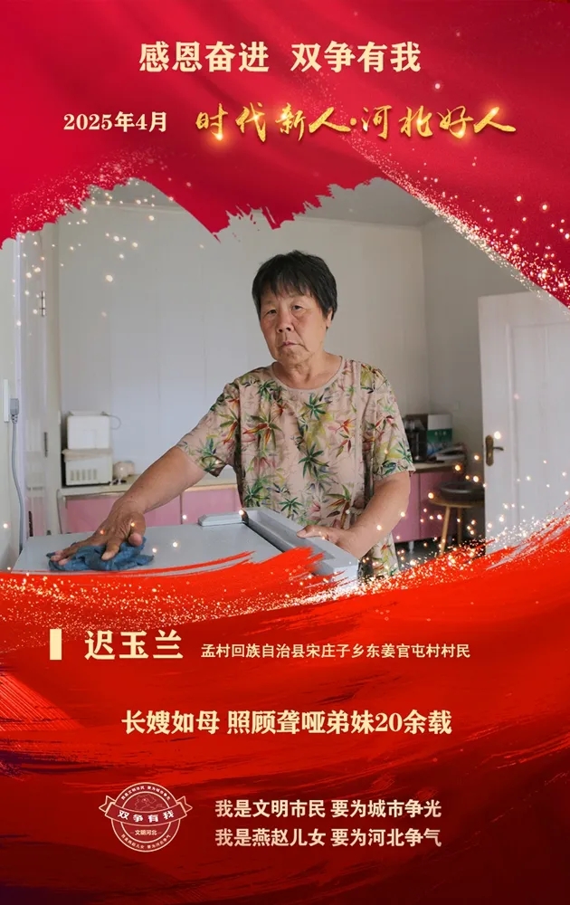 迟玉兰,女,1960年9月出生,孟村回族自治县宋庄子乡东姜官屯村村民。迟玉兰结婚时,她丈夫家有未成年的两个妹妹和一个弟弟,三个人都是听障人士,丈夫需要外出务工养家,迟玉兰便早早的担负起长嫂如母的责任,她坚守责任与义务,在平凡又平淡的生活中,温暖着人心。(沧州市推荐)