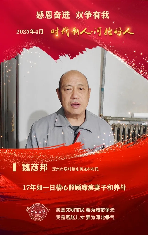 魏彦邦,男,1959年7月出生,深州市辰时镇东黄龙村村民。魏彦邦17年如一日照顾瘫痪妻子与养母,用行动诠释孝老爱亲。2008年妻子意外瘫痪后,其养母也因意外丧失自理能力。面对曾反对婚事的岳母,他不计前嫌悉心护理直至其离世,他用坚韧与包容撑起家庭,每日奔波劳作超16小时,带动村民重拾孝道家风。(衡水市推荐)