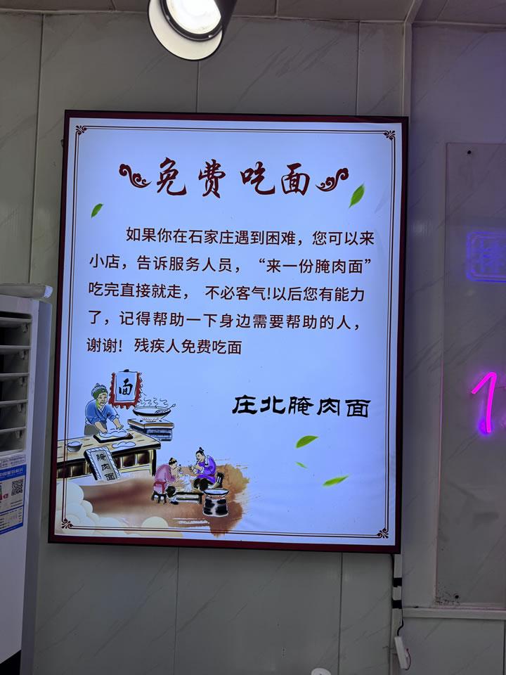 “如果你在石家庄遇到困难,可以来小店,跟服务人员说‘来一份腌肉面’,吃完直接走,不用客气……”在石家庄一家腌肉面馆的墙上,这张海报已经悬挂6年。6月11日,记者联系到了这位暖心的老板高志江。