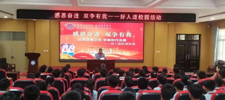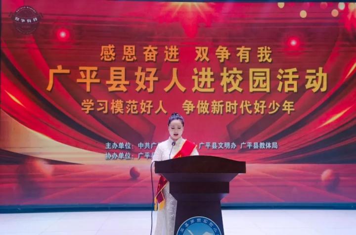 6 月 13 日,广平县 “感恩奋进 双争有我” 好人进校园活动在县第四实验小学举行。全国道德模范刘贵芳,“河北好人” 杨建强、郭彩艳走进校园,为 240 余名师生诠释 “大爱无疆” 的精神内核。活动通过 “榜样讲述 + 互动分享” 的形式,让青少年直观感受社会主义核心价值观的实践路径,为成长注入向上向善的精神动力,推动 “争做好人、争做模范” 的校园新风尚。