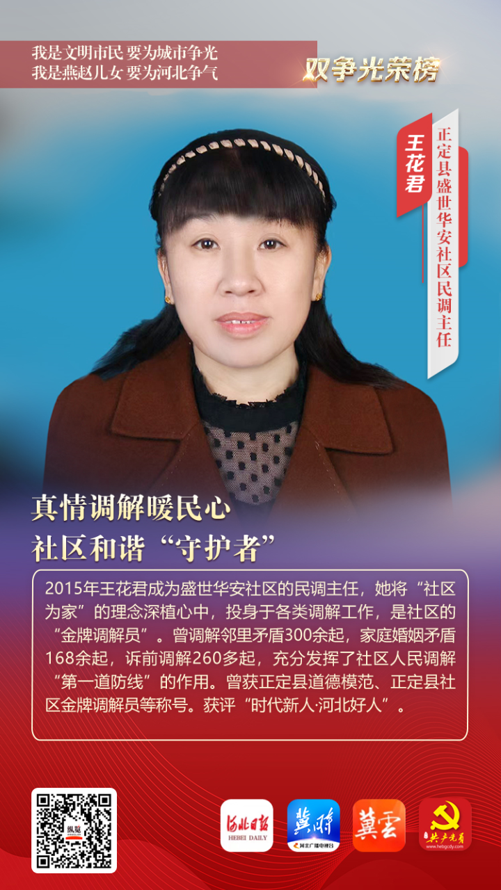 2015年王花君成为盛世华安社区的民调主任,她将“社区为家”的理念深植心中,投身于各类调解工作,是社区的“金牌调解员”。曾调解邻里矛盾300余起,家庭婚姻矛盾168余起,诉前调解260多起,充分发挥了社区人民调解“第一道防线”的作用。曾获正定县道德模范、正定县社区金牌调解员等称号。获评“时代新人·河北好人”。