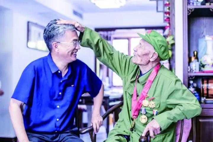 寻访拍摄11载,今年6月 ,戚辉与老战士孙圣臣相见时,孙圣臣摸着戚辉的头发说:“你的头发也白了。” 杨金忠 摄