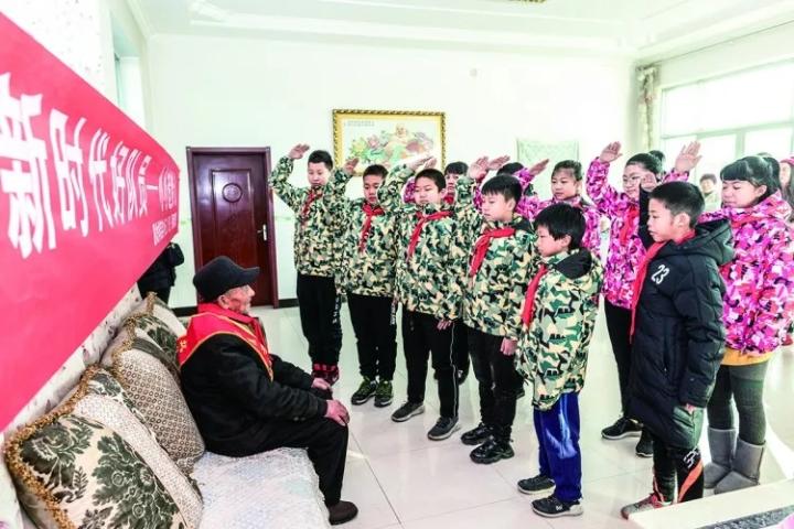 唐山市路北区祥荣实验小学学生代表探望八路军老战士王永贵。 资料片 唐山公益摄影团队提供