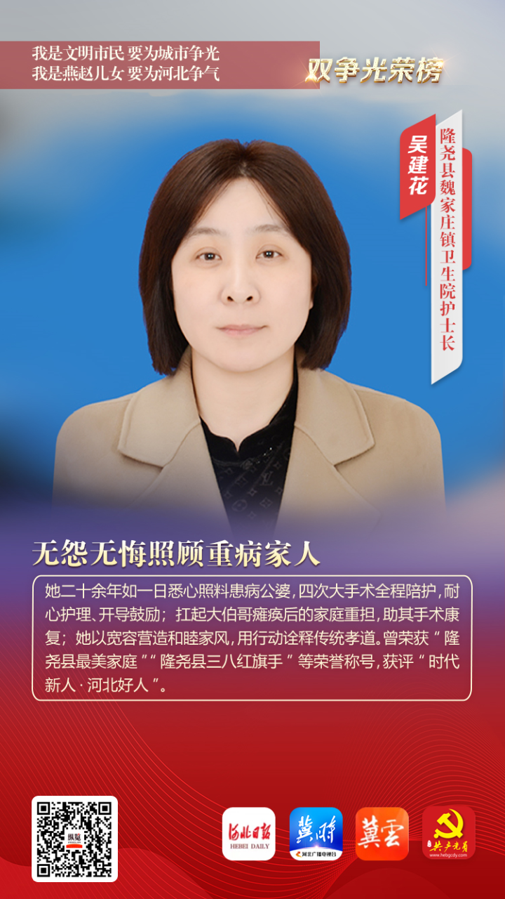 她二十余年如一日悉心照料患病公婆,四次大手术全程陪护,耐心护理、开导鼓励;扛起大伯哥瘫痪后的家庭重担,助其手术康复;她以宽容营造和睦家风,用行动诠释传统孝道。曾荣获“隆尧县最美家庭”“隆尧县三八红旗手”等荣誉称号,获评“时代新人·河北好人”。