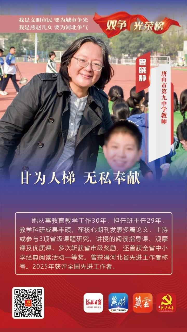 她从事教育教学工作30年,担任班主任29年,教学科研成果丰硕。在核心期刊发表多篇论文,主持或参与3项省级课题研究。讲授的阅读指导课、观摩课及优质课,多次斩获省市级奖励,还曾获全省中小学经典阅读活动一等奖。曾获得河北省先进工作者称号。2025年获评全国先进工作者。