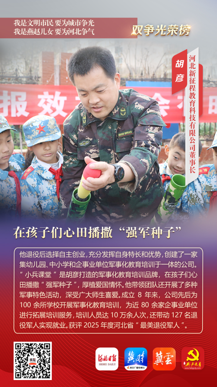 他退役后选择自主创业,充分发挥自身特长和优势,创建了一家集幼儿园、中小学和企事业单位军事化教育培训于一体的公司。“小兵课堂”是胡彦打造的军事化教育培训品牌,在孩子们心田播撒“强军种子”,厚植爱国情怀。他带领团队还开展了多种军事特色活动,深受广大师生喜爱。成立8年来,公司先后为100余所学校开展军事化教育培训,为近80余家企事业单位进行拓展培训服务,培训人员达10万余人次,还带动127名退役军人实现就业。获评2025年度河北省“最美退役军人”。