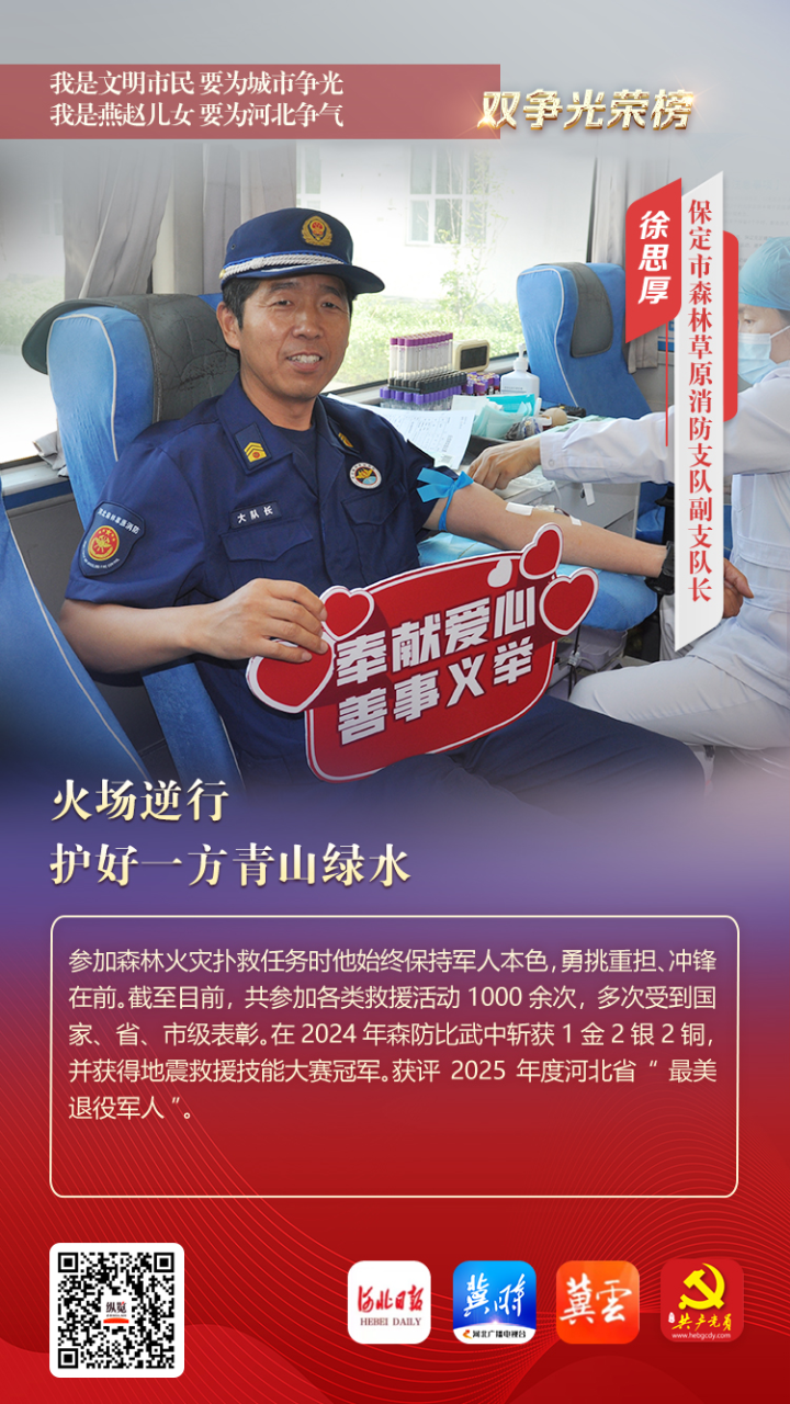 参加森林火灾扑救任务时他始终保持军人本色,勇挑重担、冲锋在前。截至目前,共参加各类救援活动1000余次,多次受到国家、省、市级表彰。在2024年森防比武中斩获1金2银2铜,并获得地震救援技能大赛冠军。获评2025年度河北省“最美退役军人”。