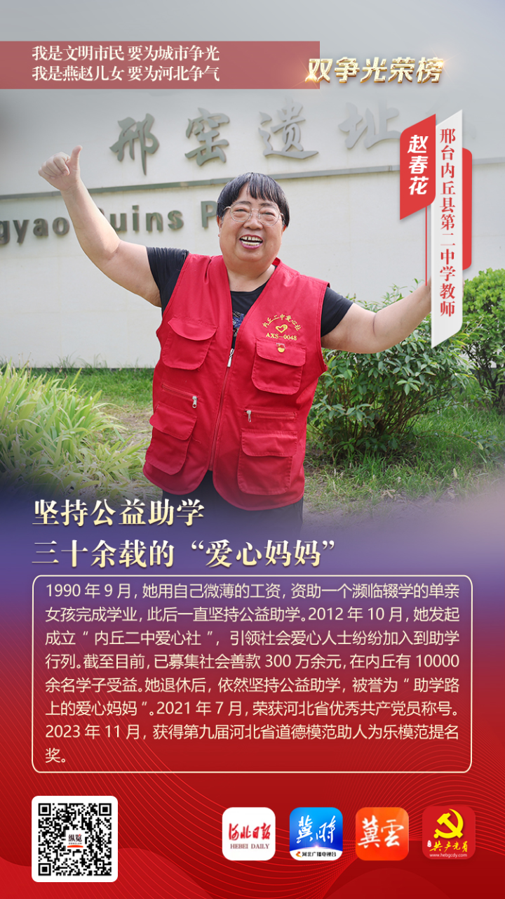 赵春花,女,1965年4月出生,中共党员,邢台内丘县第二中学教师,“内丘二中爱心社”发起人。