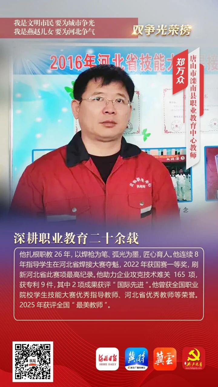 他扎根职教26年,以焊枪为笔、弧光为墨,匠心育人。他连续8年指导学生在河北省焊接大赛夺魁,2022年获国赛一等奖,刷新河北省此赛项最高纪录。他助力企业攻克技术难关165项,获专利9件,其中2项成果获评“国际先进”。他曾获全国职业院校学生技能大赛优秀指导教师、河北省优秀教师等荣誉。2025年获评全国“最美教师”。