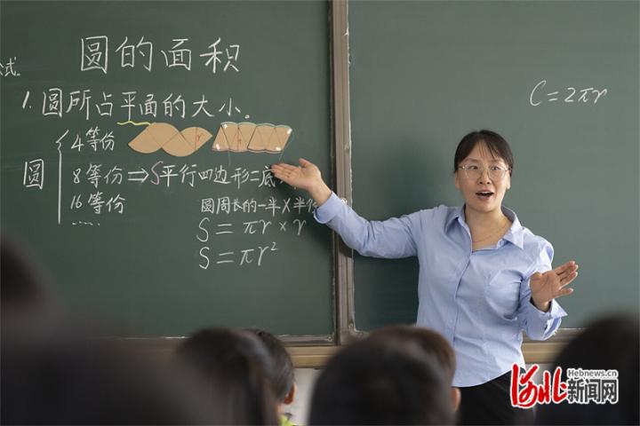 学生们拿出用废旧纸板剪出的圆,跟着王月霞,沿半径将圆板平均剪成若干份,然后拼成一近似的平行四边形。“大家看,近似平行四边形的底约是圆周长的一半,高是圆的半径。纸板形状虽然发生了变化,但面积还是原来的面积。”她说。