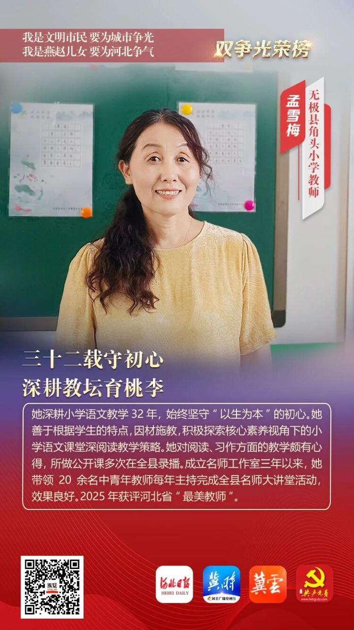 孟雪梅,无极县角头小学教师,石家庄市学科名师、骨干教师、先进德育工作者。