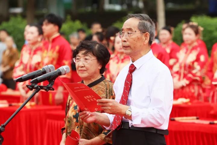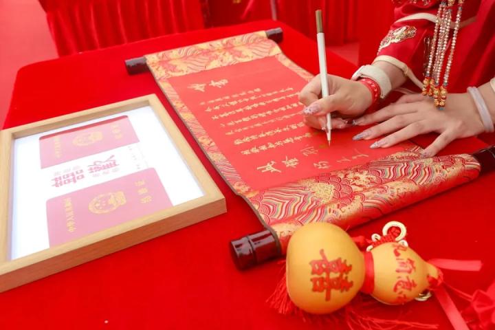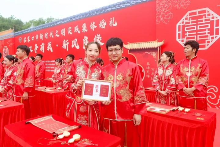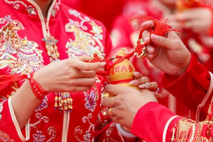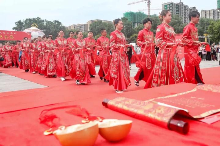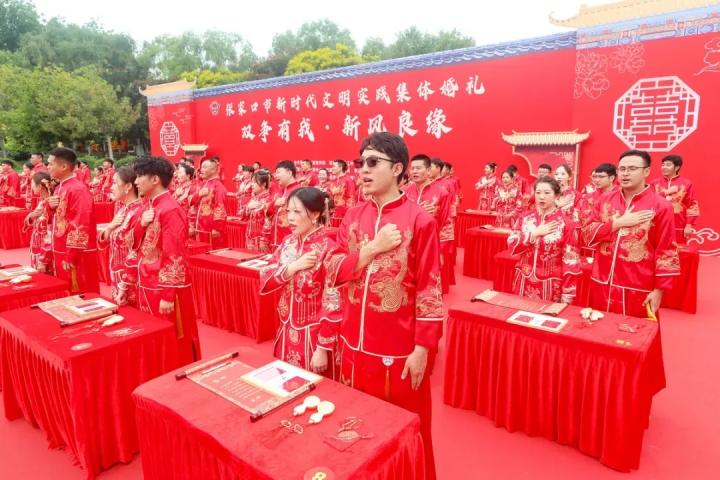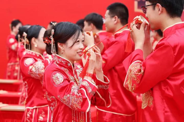 活动现场,新人们身着中式婚服,在传统礼仪的见证下喜结良缘,以简约典雅之姿,诠释着新时代的婚俗新风尚。