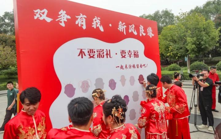 婚礼现场还精心设置了新人巡场、幸福微笑墙打卡、集体婚礼朋友圈、移风易俗连连看等充满趣味的环节,吸引了新人和现场宾客积极参与。大家纷纷在移风易俗网红打卡区拍照留念,记录美好瞬间。众人沉浸式领略中华优秀传统文化的独特魅力,现场欢声笑语,洋溢着浓厚的喜庆氛围。