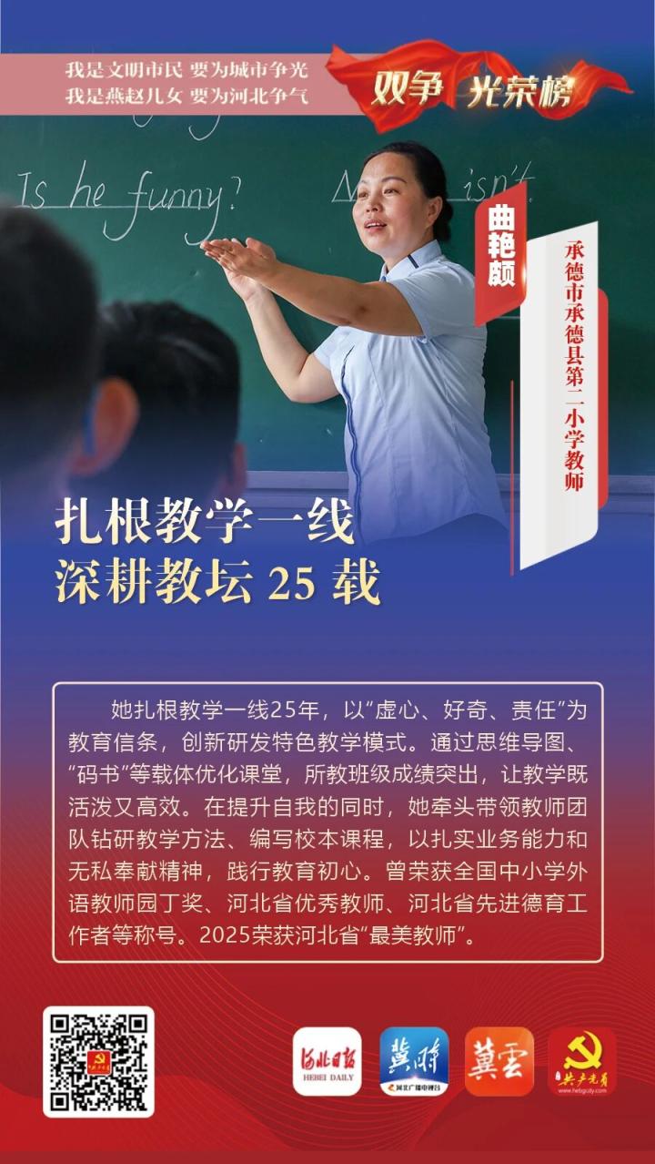 她扎根教学一线25年,以“虚心、好奇、责任”为教育信条,创新研发特色教学模式。通过思维导图、“码书”等载体优化课堂,所教班级成绩突出,让教学既活泼又高效。在提升自我的同时,她牵头带领教师团队钻研教学方法、编写校本课程,以扎实业务能力和无私奉献精神,践行教育初心。曾荣获全国中小学外语教师园丁奖、河北省优秀教师、河北省先进德育工作者等称号。2025荣获河北省“最美教师”。