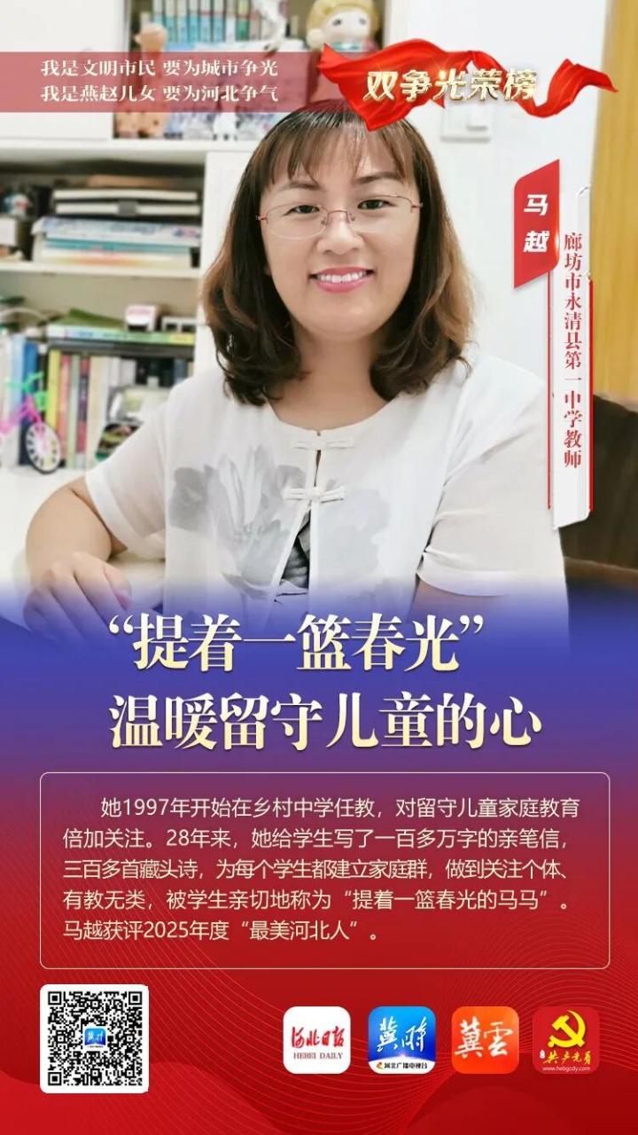 她1997年开始在乡村中学任教,对留守儿童家庭教育倍加关注。28年来,她给学生写了一百多万字的亲笔信,三百多首藏头诗,为每个学生都建立家庭群,做到关注个体、有教无类,被学生亲切地称为“提着一篮春光的马马”。获评2025年度“最美河北人”。