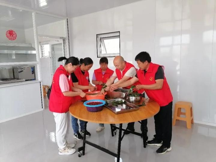 志愿者在涿鹿县付庄村的“孝老食堂”里村内孤寡老人准备粽子