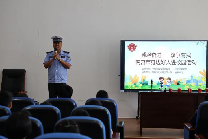 为培育和践行社会主义核心价值观,充分发挥身边好人的示范引领作用,推进未成年人思想道德建设,9月18日,南宫市“感恩奋进 双争有我”身边好人进校园活动走进南街小学,此次活动由市委宣传部、市教育局主办,市交警大队、南街小学承办,通过分享身边好人事迹与文明交通宣讲相结合的形式,为师生带来了一堂生动而深刻的道德教育与安全实践课。