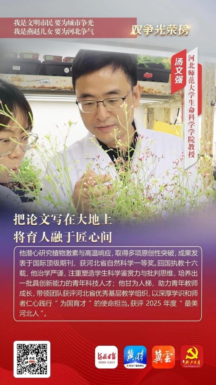 他潜心研究植物激素与高温响应,取得多项原创性突破,成果发表于国际顶级期刊,获河北省自然科学一等奖。回国执教十六载,他治学严谨,注重塑造学生科学鉴赏力与批判思维,培养出一批具创新能力的青年科技人才;他甘为人梯,助力青年教师成长,带领团队获评河北省优秀基层教学组织,以深厚学识和师者仁心践行“为国育才”的使命担当。获评2025年度“最美河北人”。